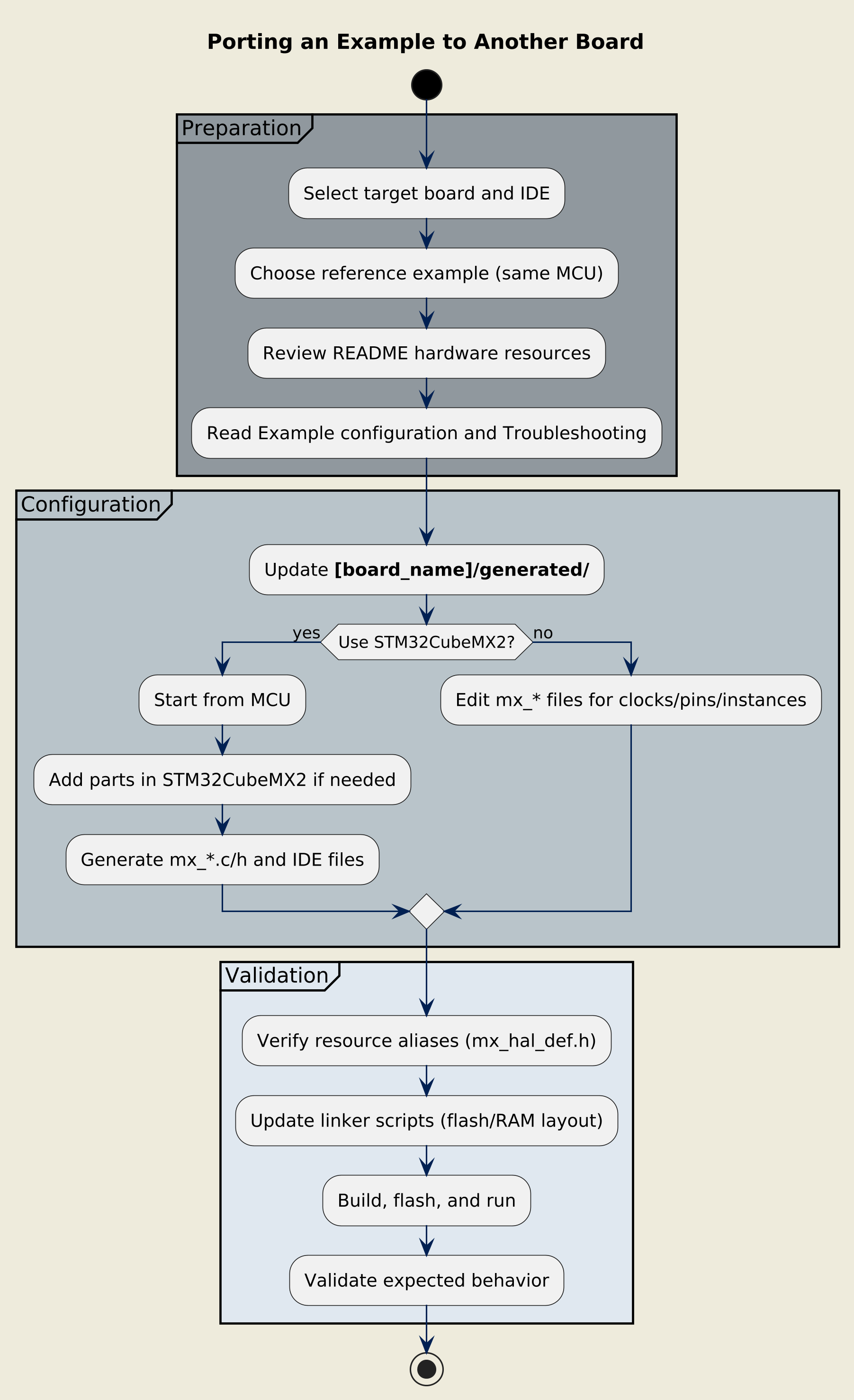 Porting an example requires updating the board-specific configuration while keeping the use-case code intact. The steps below provide a consistent approach for HAL, LL, middleware, and utilities examples.