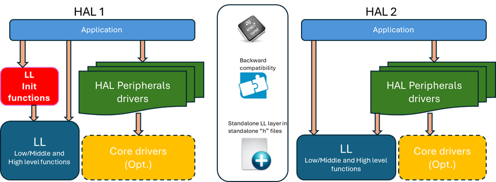 HAL2 depends on LL drivers for register access, promoting consistent and reliable hardware interaction. This separation improves code maintainability and readability, with any LL driver updates automatically benefiting HAL.