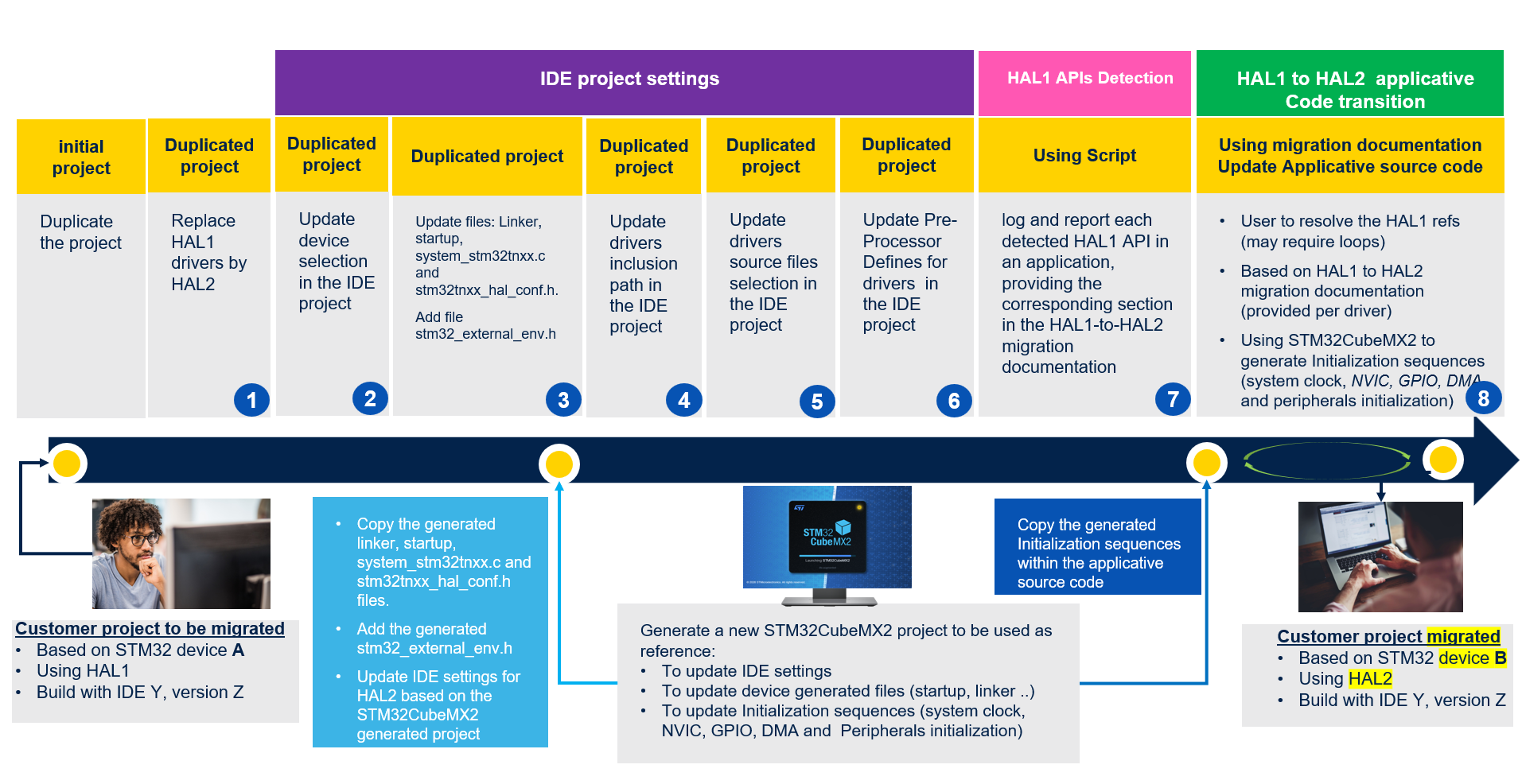 Using STM32CubeMX2 for initialization sequences and IDE project settings : the recommended migration journey uses STM32CubeMX2 for application code sequences related to initialization. It generates the required HAL2 initialization sequences, including the target peripherals, and the clock, NVIC, and GPIO services needed by these peripherals. STM32CubeMX2 is also used as a reference for HAL1-to-HAL2 changes made through the IDE, such as include paths and pre-processor settings.