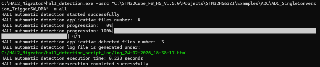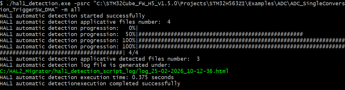 ./hal1_detection.exe -psrc "C:\STM32Cube_FW_H5_V1.5.0\Projects\STM32H563ZI\Examples\ADC\ADC_SingleConversion_TriggerSW_DMA" -m all