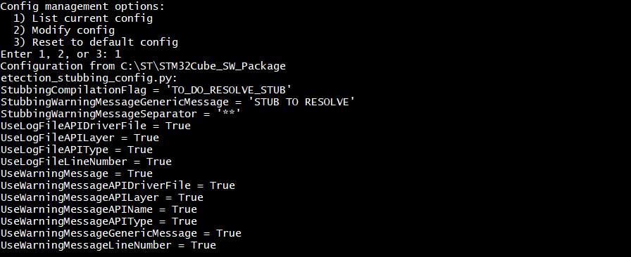 Use one of the following commands to display the current configuration settings, including all stubbing and warning message options. # Using the Python script