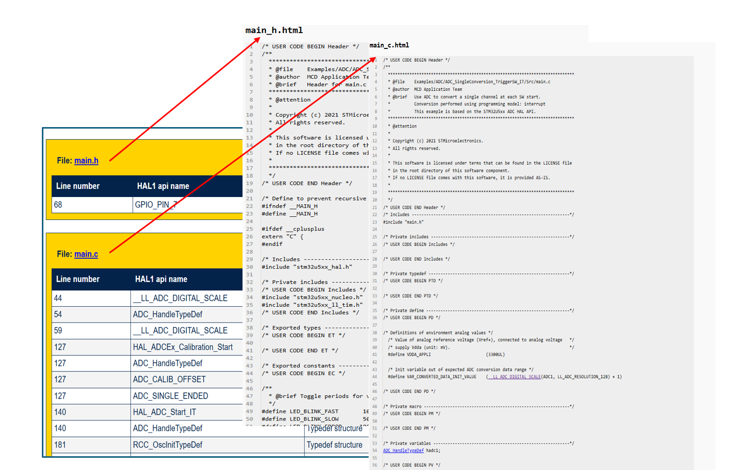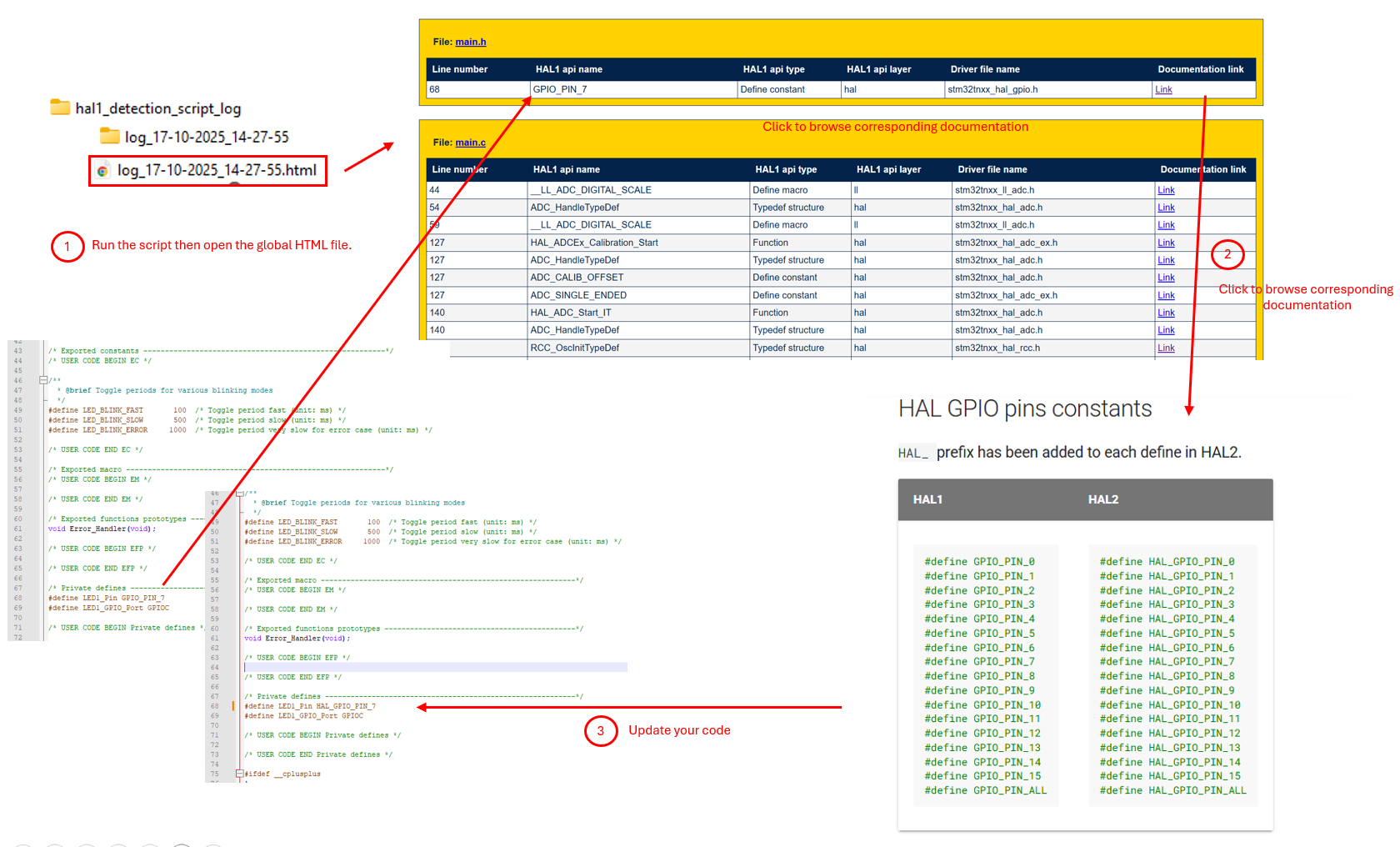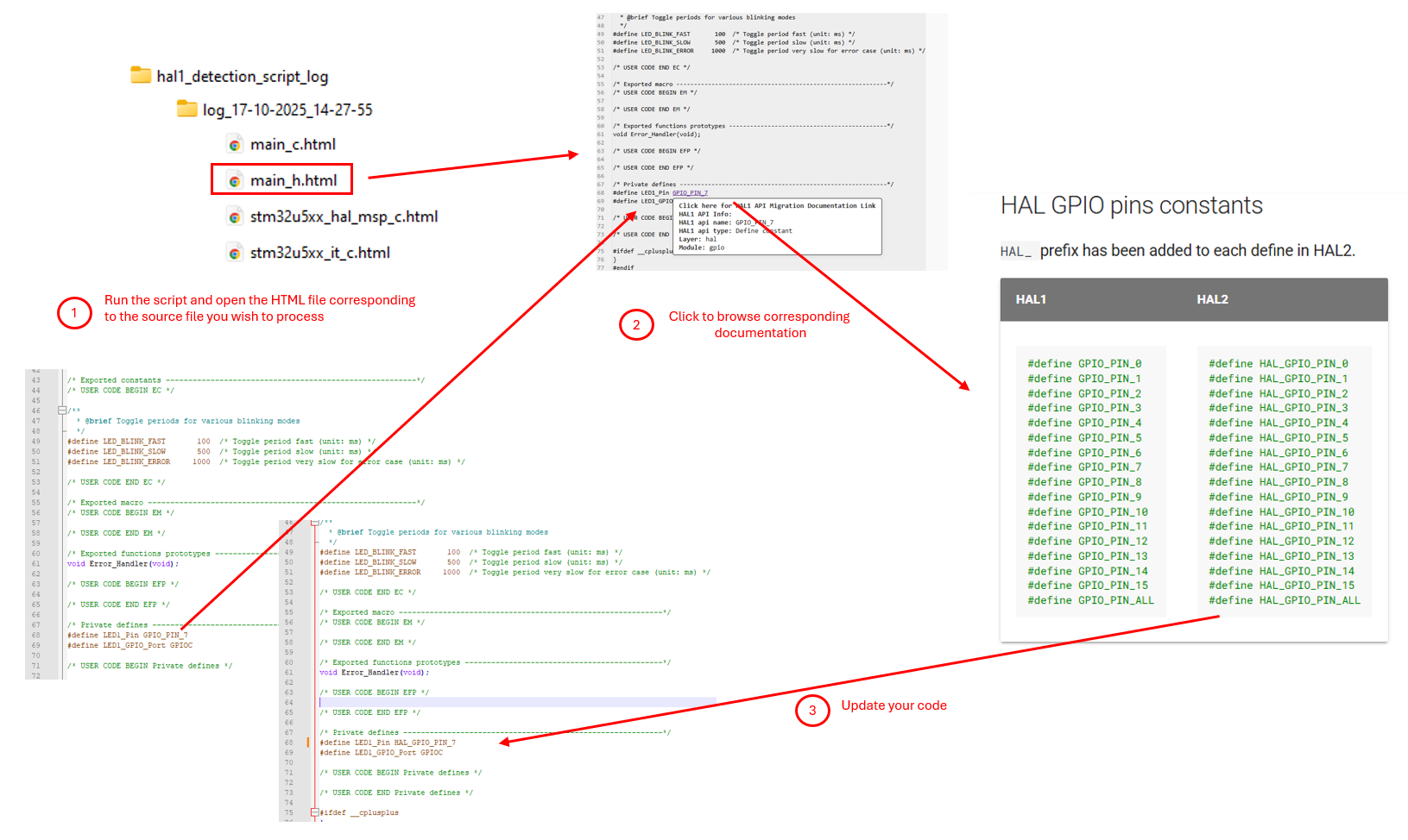 The log file generated by the HAL1 detection script is in HTML format. It includes excerpts of the user application code where HAL1 APIs are identified.