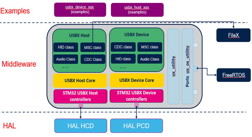 USBX Core and Class Drivers USB protocol engine and standard class implementations (CDC, MSC, HID, etc.). This layer is independent from any specific STM32 device.